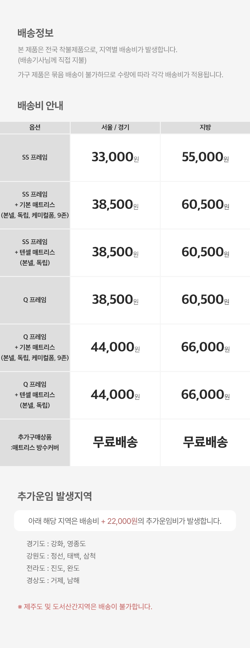 - 배송비 : 착불배송 상품별/지역별 상이합니다. (도서,산간,오지 일부지역은 배송비가 추가될 수 있습니다)