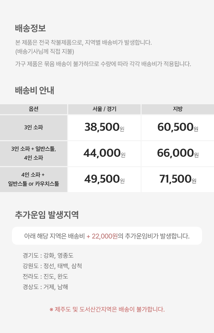 - 배송비 : 착불배송 상품별/지역별 상이합니다. (도서,산간,오지 일부지역은 배송비가 추가될 수 있습니다)