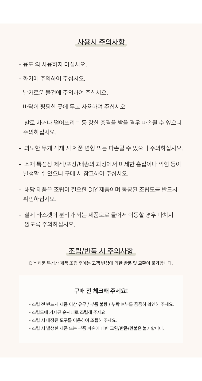 - 고객 변심에 의한 교환, 반품은 고객께서 배송비를 부담하셔야 합니다(제품의 하자,배송오류는 제외)