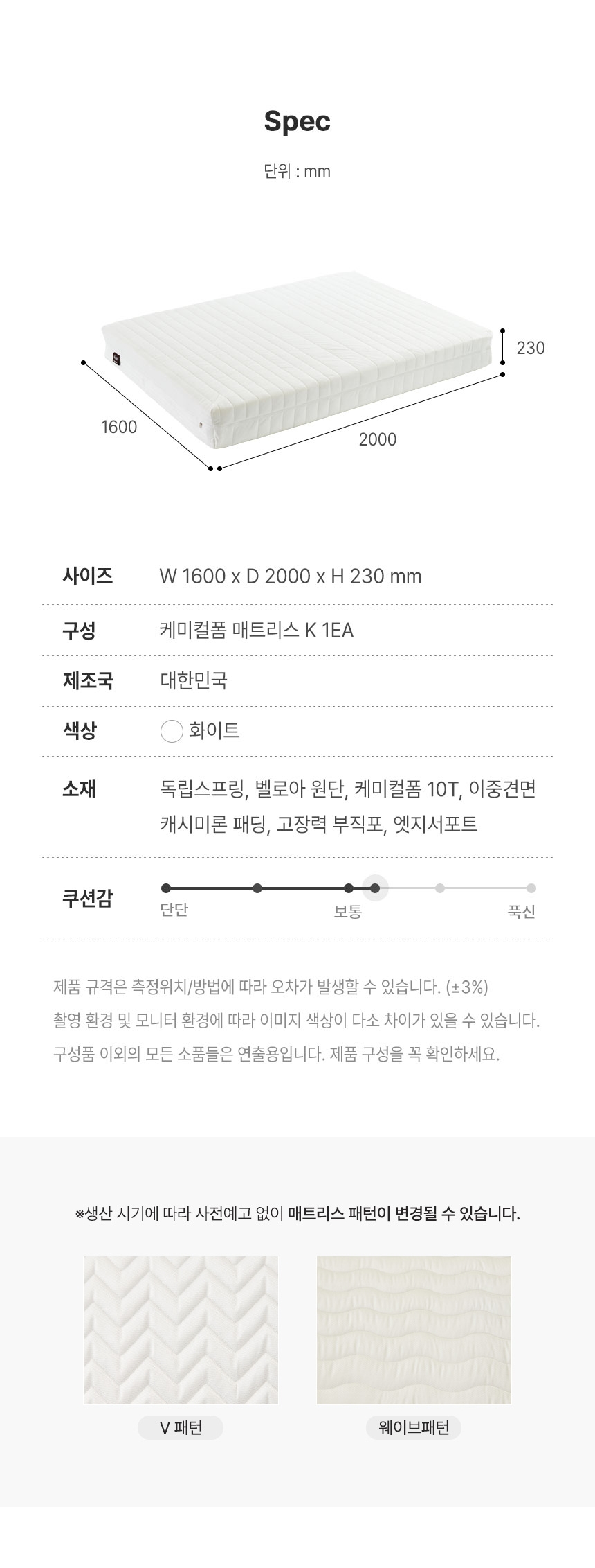 | 주요 소재 | 벨로아 원단,캐시미론 패딩,고장력 부직포,케미컬폼 10T,이중견면,독립스프링,이중견면,고장력 부직포,캐시미론 패딩,벨로아 원단 | ||